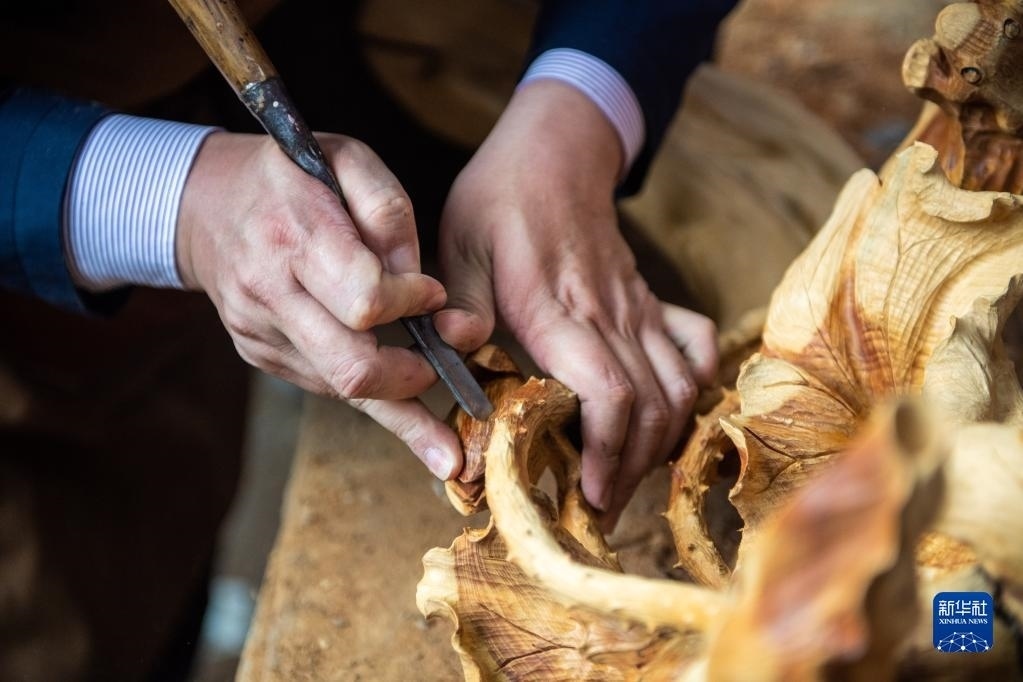 5月23日,在洞口縣巖山鎮(zhèn)陽家山村,洞口木雕非遺傳承人傅立先在創(chuàng)作木雕作品《絲綢之路》。