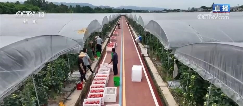 總臺記者 蔣林:歡迎各位繼續(xù)跟隨著我們在四川看看“三夏”時節(jié)的農(nóng)忙景象。此刻我從平原地區(qū)的水稻高標(biāo)準(zhǔn)農(nóng)田來到了金銀河村的蔬菜種植產(chǎn)業(yè)園。通過空中航拍的畫面大家可以看到,金銀河村緊臨著長江的三級支流青衣江,歷史上的金銀河村就是來自青衣江的沖刷和堆積,村里的土地含沙量高,土壤保水能力不夠,不適合栽種像水稻這樣的需要農(nóng)田蓄水、保水的作物。當(dāng)然,這樣的土地對于很多蔬菜品種來說,卻是絕佳好地,當(dāng)?shù)匾虻刂埔烁闫鹆怂竞褪卟斯灿械默F(xiàn)代產(chǎn)業(yè)園區(qū)。在這個園區(qū),適合蔬菜種植的面積達到7萬畝,平均一年能種三季蔬菜,大大提升了土地產(chǎn)出與利用效果,也保證了每一個人的“菜籃子”。眼下,今年春天播種的番茄、黃瓜、茄子、豇豆等眾多時令蔬菜陸續(xù)成熟,新鮮上市,讓我們感受到初夏時節(jié)的豐收景象。