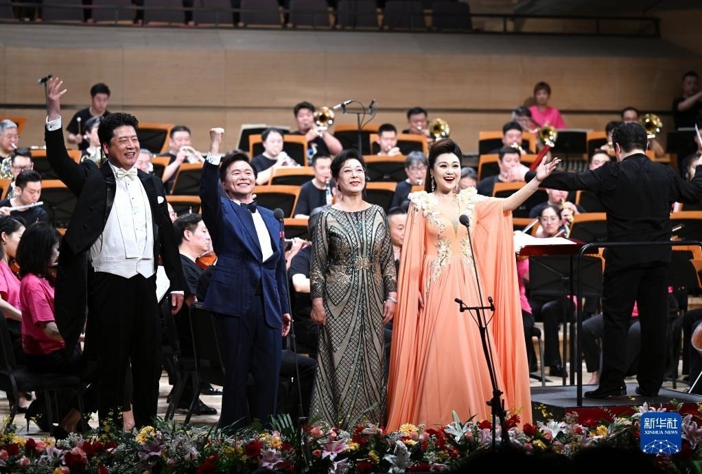 5月25日,在天津大劇院音樂廳,歌唱家王澤南(左一)、王宏偉(左二)、關(guān)牧村(左三)、張晏蓉等在舞臺上演出。