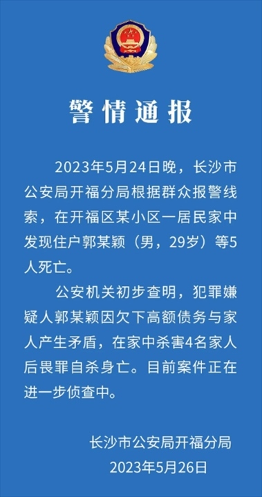 ·警方通報(bào)長沙某小區(qū)房?jī)?nèi)發(fā)現(xiàn)5具尸體:男子殺害4名家人后畏罪自殺。