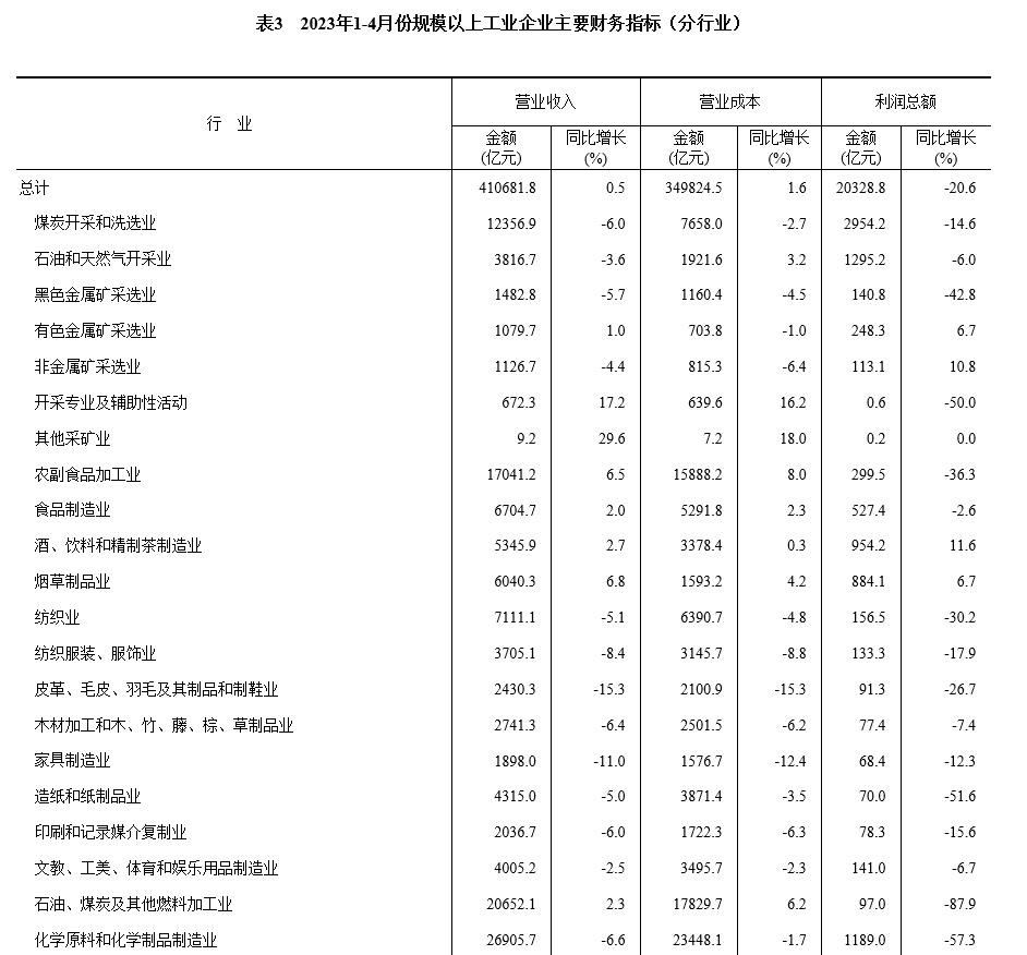 1—4月份,在41個工業(yè)大類行業(yè)中,13個行業(yè)利潤總額同比增長,1個行業(yè)持平,27個行業(yè)下降。主要行業(yè)利潤情況如下:電力、熱力生產(chǎn)和供應(yīng)業(yè)利潤總額同比增長47.2%,電氣機械和器材制造業(yè)增長30.1%,通用設(shè)備制造業(yè)增長20.7%,汽車制造業(yè)增長2.5%,石油和天然氣開采業(yè)下降6.0%,專用設(shè)備制造業(yè)下降7.4%,煤炭開采和洗選業(yè)下降14.6%,非金屬礦物制品業(yè)下降27.4%,紡織業(yè)下降30.2%,農(nóng)副食品加工業(yè)下降36.3%,計算機、通信和其他電子設(shè)備制造業(yè)下降53.2%,有色金屬冶煉和壓延加工業(yè)下降55.1%,化學(xué)原料和化學(xué)制品制造業(yè)下降57.3%,石油、煤炭及其他燃料加工業(yè)下降87.9%,黑色金屬冶煉和壓延加工業(yè)下降99.4%。