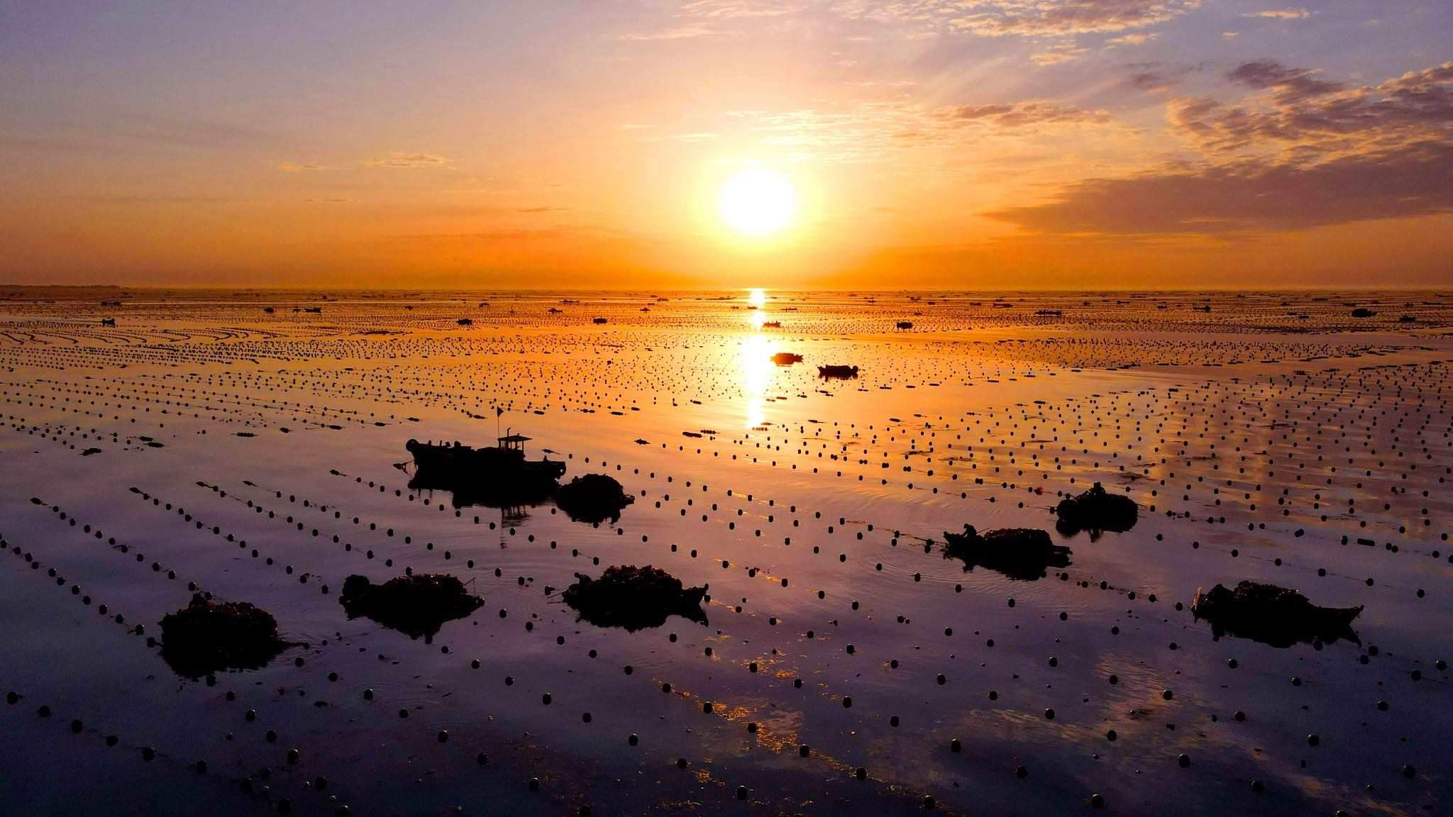 2023年5月31日,山東威海,榮成愛(ài)倫灣海洋牧場(chǎng),漁民駕駛船只在海上收獲海帶,美麗的朝霞倒影在海上,海鷗伴舞,海洋牧場(chǎng)到處呈現(xiàn)一派豐收的喜人景象。視覺(jué)中國(guó)