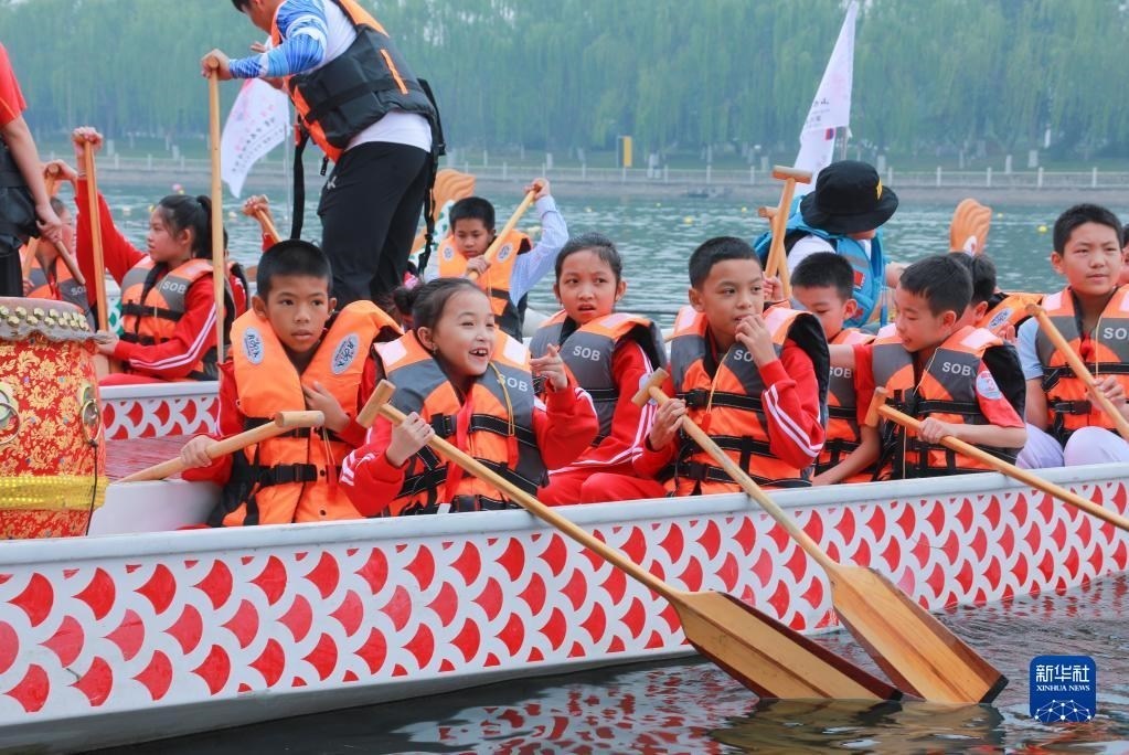 5月27日,在北京半壁店村,老撾學(xué)生和北京八一學(xué)校的學(xué)生舉行龍舟友誼賽。