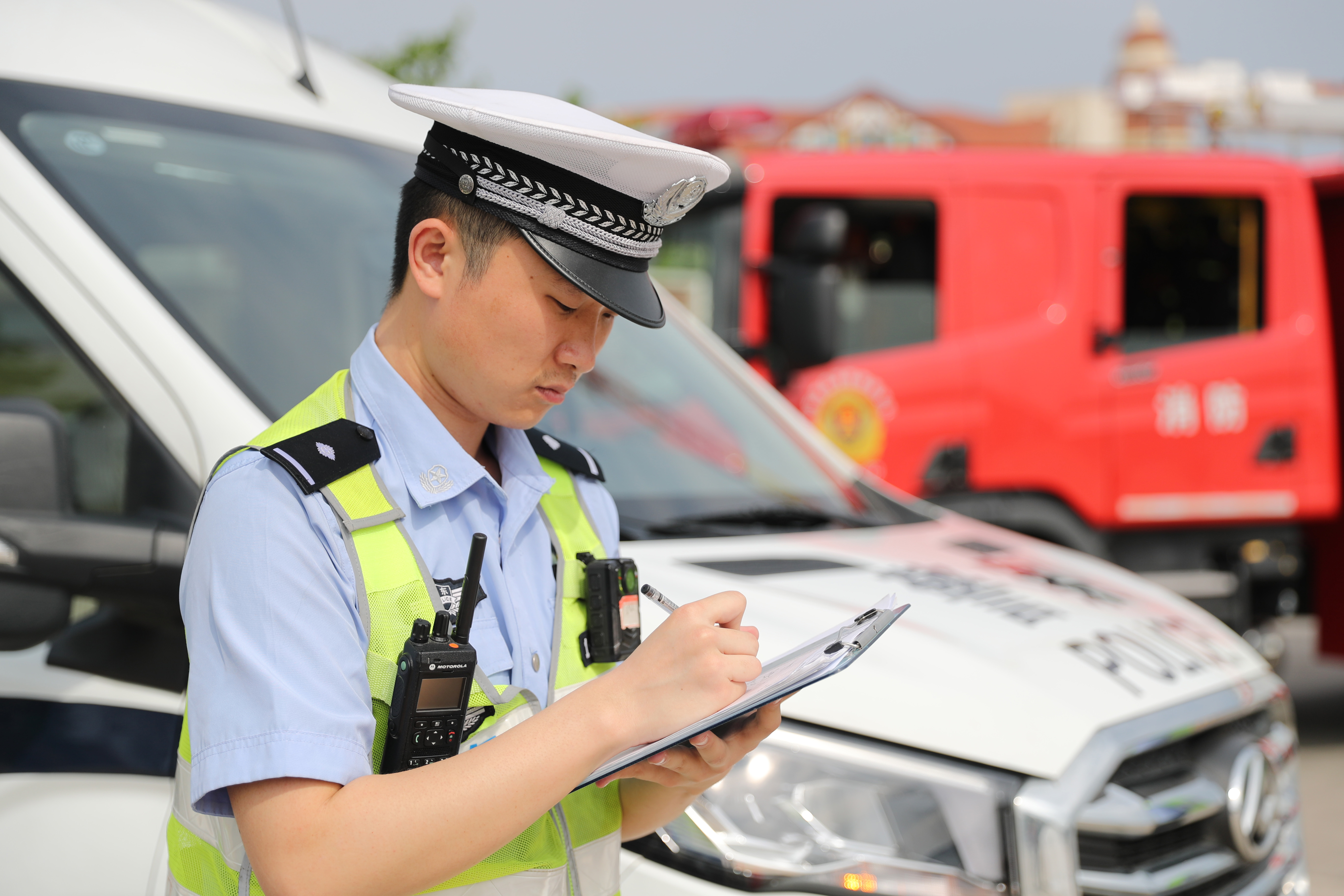 5月30日,交警在演練現(xiàn)場做案情記錄。(張進剛 攝)