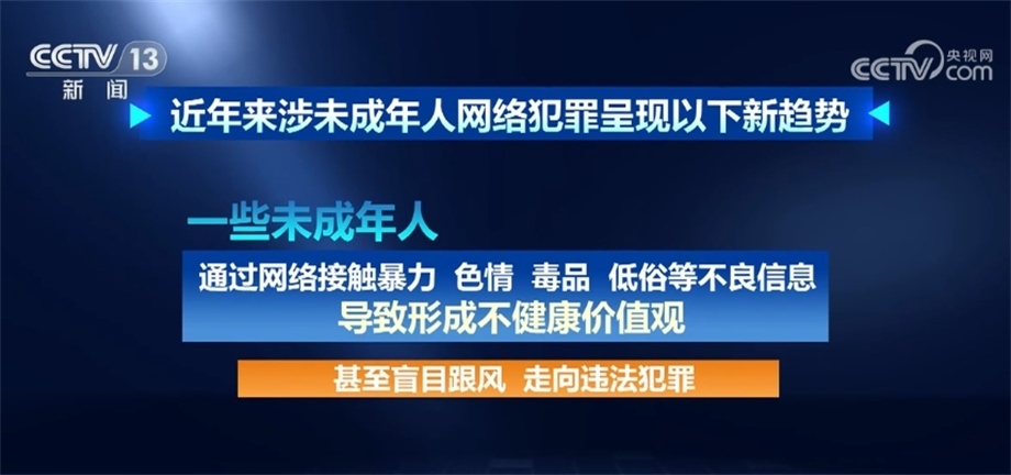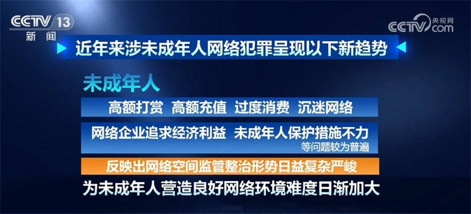 據(jù)最高檢相關(guān)部門負(fù)責(zé)人介紹,近年來(lái)涉未成年人網(wǎng)絡(luò)犯罪呈現(xiàn)以下新趨勢(shì):未成年人觸網(wǎng)低齡化日趨明顯,更易遭受網(wǎng)絡(luò)不法侵害;利用網(wǎng)絡(luò)侵害未成年人犯罪手段復(fù)雜多樣,方式不斷翻新,“網(wǎng)絡(luò)誘騙”“隔空猥褻”等新類型犯罪隱蔽性強(qiáng)、打擊難度大;一些未成年人通過(guò)網(wǎng)絡(luò)接觸暴力、色情、毒品、低俗等不良信息,導(dǎo)致形成不健康價(jià)值觀,甚至盲目跟風(fēng)、走向違法犯罪;未成年人高額打賞、高額充值、過(guò)度消費(fèi)、沉迷網(wǎng)絡(luò),網(wǎng)絡(luò)企業(yè)追求經(jīng)濟(jì)利益、未成年人保護(hù)措施不力等問題較為普遍,反映出網(wǎng)絡(luò)空間監(jiān)管整治形勢(shì)日益復(fù)雜嚴(yán)峻,為未成年人營(yíng)造良好網(wǎng)絡(luò)環(huán)境難度日漸加大。