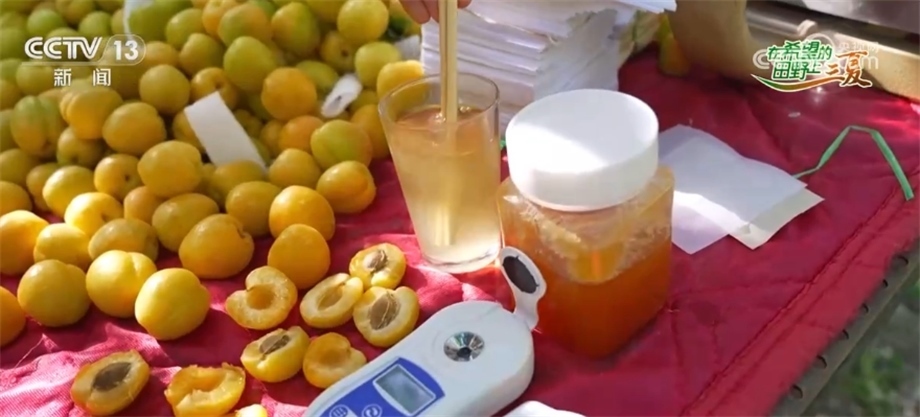 其實輪臺白杏在新疆本地也是非常有口碑的。大家知道嗎?輪臺白杏在當(dāng)?shù)匾脖环Q作是“白色蜂蜜”,那它到底擔(dān)不擔(dān)得起這個稱號?我們今天在現(xiàn)場給大家?guī)砹艘粋€小的試驗,這是一杯白水加了三勺蜂蜜,可以看到它已經(jīng)是蜂蜜水的顏色了,我們通過測糖儀來測一下蜂蜜水的糖度,17度。那我們來測一下我們剛才嘗的這個輪臺白杏,擠一些它的汁液出來,16度,已經(jīng)非常接近蜂蜜水的甜度了。