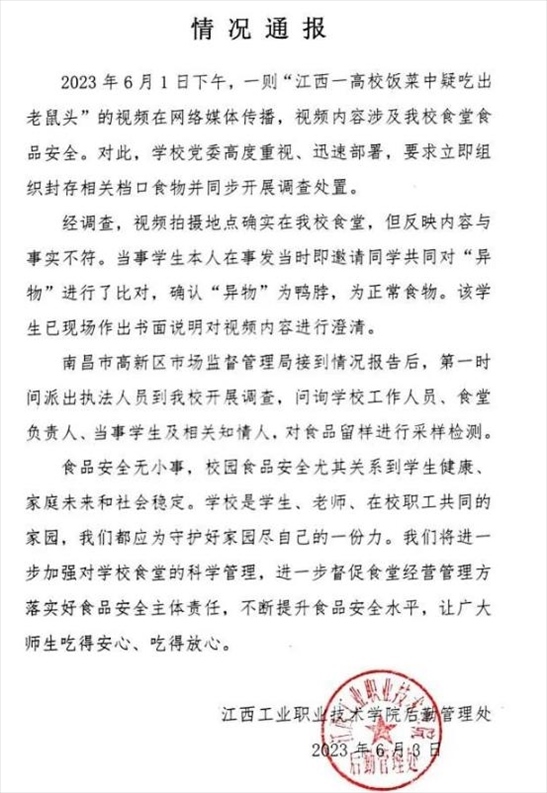 ·江西一學校食堂吃出“老鼠頭”?校方通報:“異物”是鴨脖。