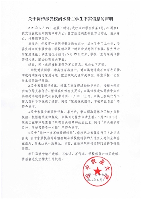 ·學生溺水身亡、不給家長看監(jiān)控視頻?華中農(nóng)業(yè)大學回應:傳言不實。