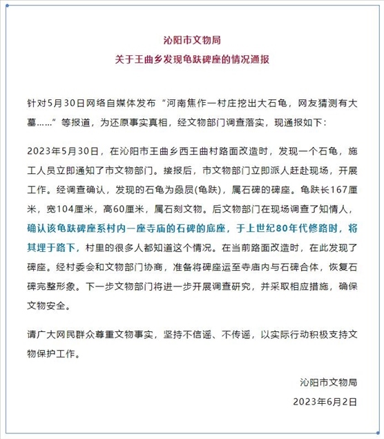 ·河南焦作一村莊修路挖出大石龜,沁陽市文物局發(fā)布情況通報:上世紀80年代修路時埋于路下。