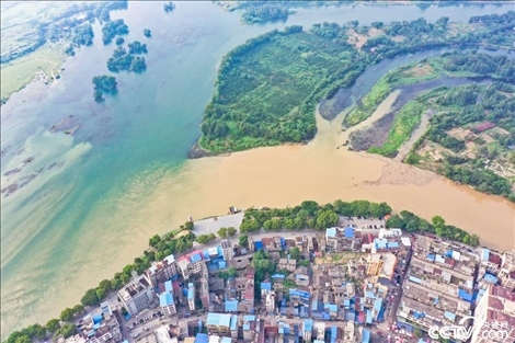 受降雨影響,廣西桂林全州縣城湘江河段出現(xiàn)涇渭分明景觀。空中俯瞰,湘江支流萬鄉(xiāng)河混濁的河水繞城匯入清澈的湘江干流,交匯之處涇渭分明。