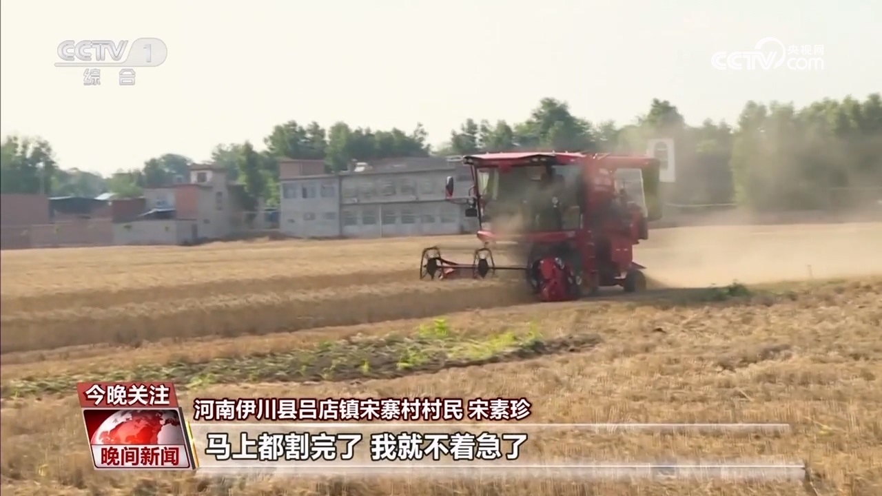 伊川縣呂店鎮(zhèn)宋寨村村民 宋素珍:前幾天下雨小麥?zhǔn)詹换貋?lái),心里可心慌,鄉(xiāng)里派履帶式收割機(jī),我這十幾畝地馬上都挨?。ㄝ喌剑┝?,馬上都割完了,我就不著急了。