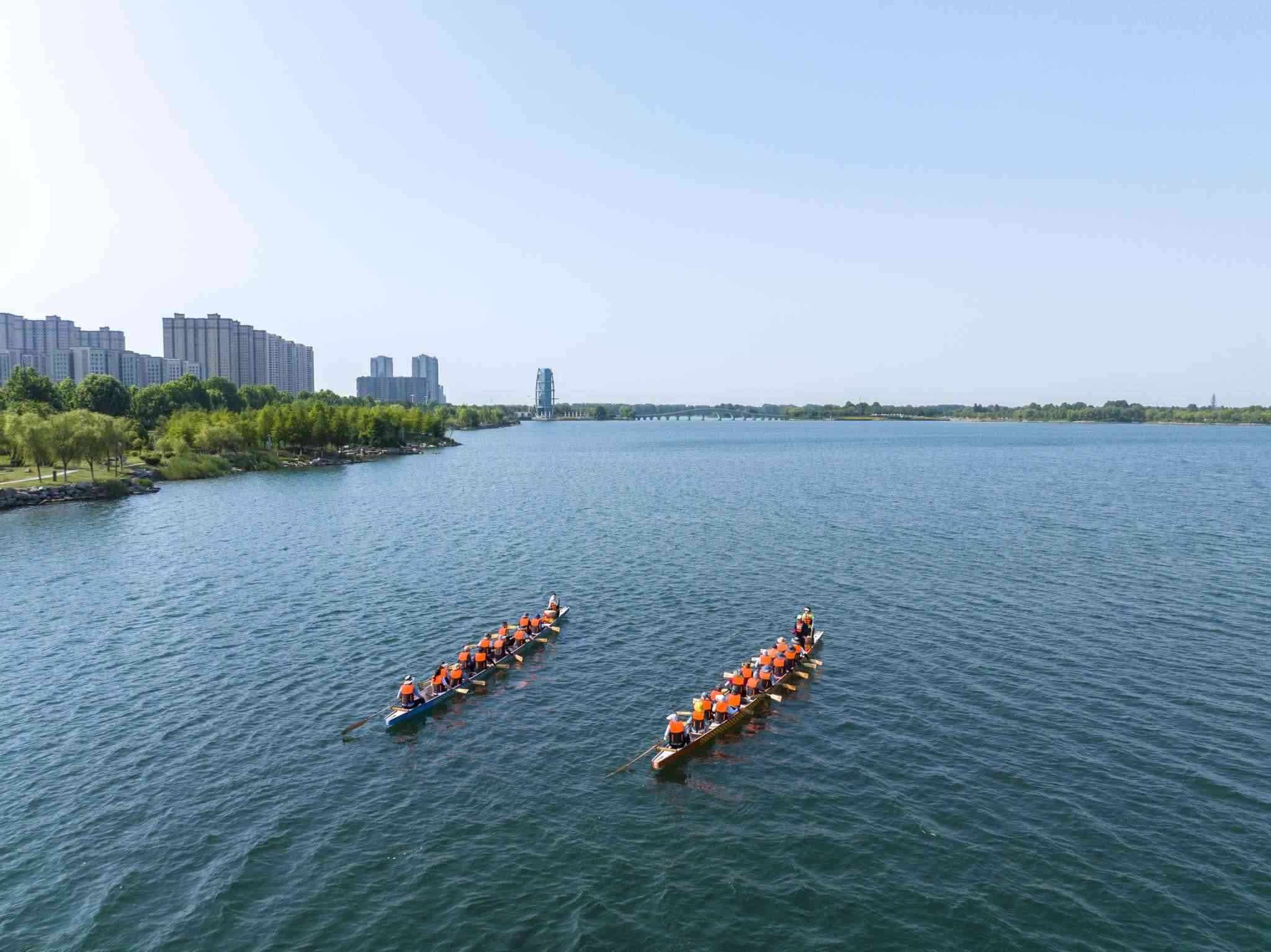 2023年6月8日,江蘇連云港,東??h西雙湖風(fēng)景區(qū),多支龍舟隊(duì)在西雙湖水域進(jìn)行訓(xùn)練,積極備戰(zhàn)端午龍舟賽。視覺中國(guó)