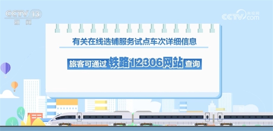 央視網(wǎng)消息:記者從國(guó)鐵集團(tuán)獲悉,今天(6月10日)起,鐵路部門將在12306網(wǎng)站和12306手機(jī)客戶端試行在線選鋪服務(wù)。