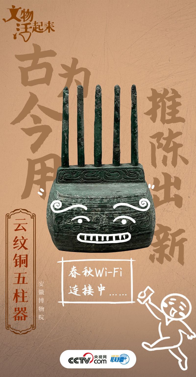 這件文物名為“云紋銅五柱器”,斷代為西周(公元前1046年-公元前771年),用途待考。早年有人認為它是樂器,該觀點很快被否定。后有人認為是某種器物的底座,亦是語焉不詳。還有人認為是古人祭祀祖先時插先祖牌位的底座,這種觀點也有待于學(xué)術(shù)界論證。