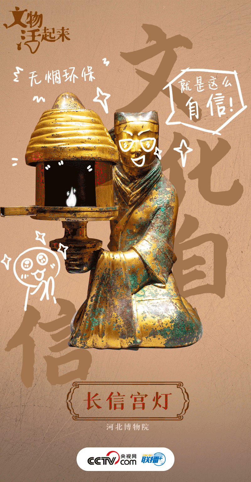 這盞燈來自西漢(公元前202年-公元8年),因燈身刻有“長信尚浴”的銘文而得名長信宮燈。長信宮燈設(shè)計巧妙,是目前所見唯一一件漢代人形銅燈,整件燈分為六個部分,每部分都可以簡單地拆卸重裝,宮女的袖管與身體連接形成排煙通道,環(huán)保設(shè)計理念獨特、超前,被譽為“中華第一燈”。