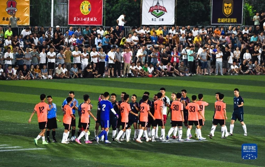 6月9日,鳳凰村足球隊與新中村足球隊在比賽結(jié)束后相互擊掌致意。   新華社記者 楊文斌 攝