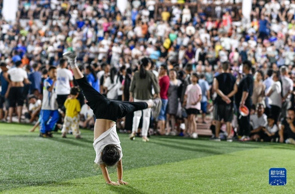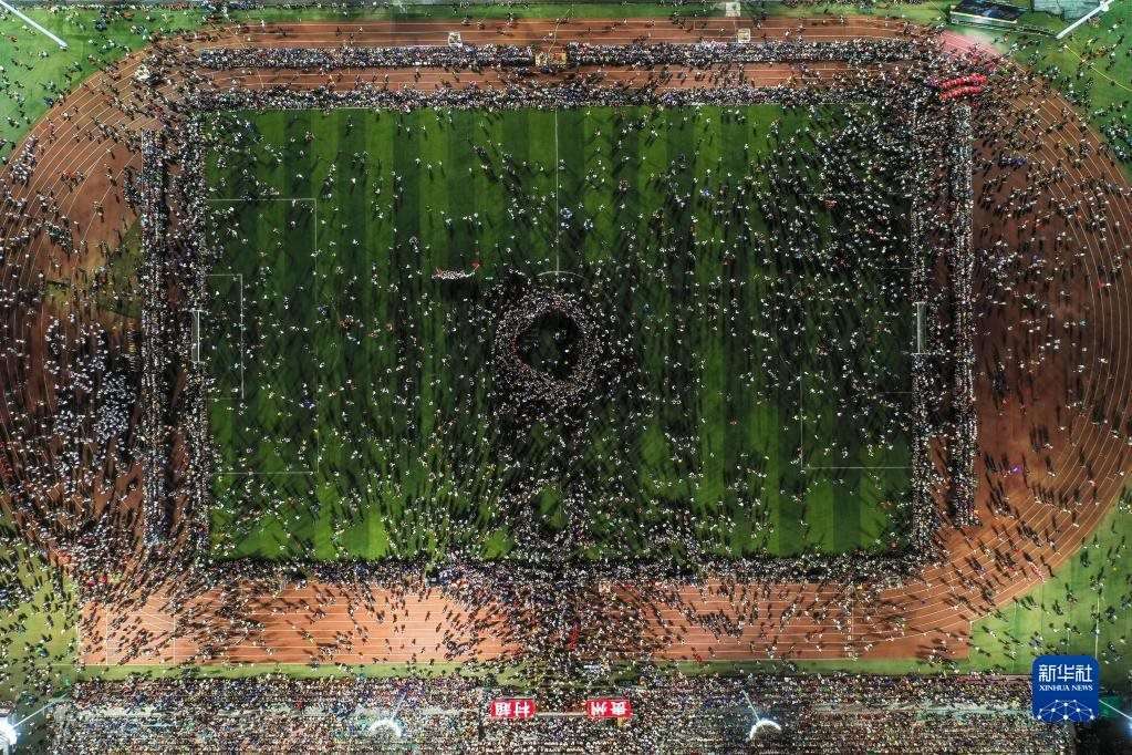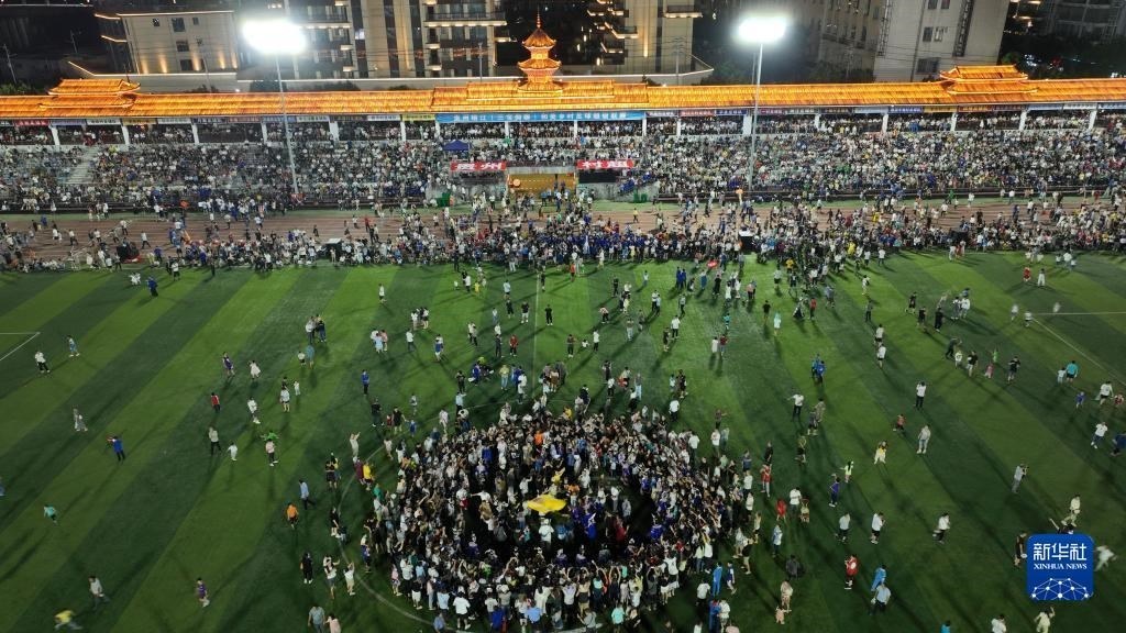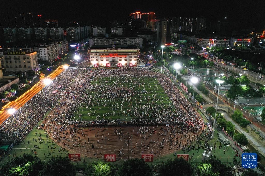 6月10日,演員在貴州“村超”足球比賽后表演民族舞蹈“多耶”,現(xiàn)場觀眾一起上場狂歡(無人機照片)。   新華社記者 楊文斌 攝