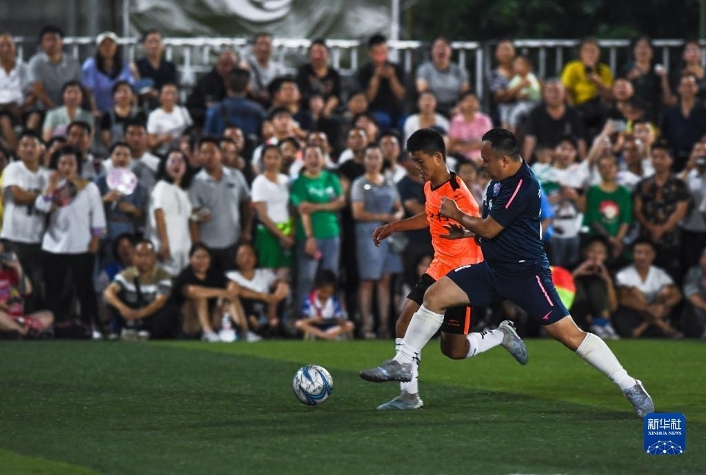 6月9日,新中村足球隊球員(左)與鳳凰村足球隊球員在比賽中拼搶。   新華社記者 楊文斌 攝