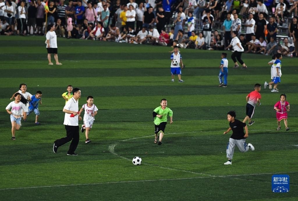 6月9日,小朋友在貴州“村超”足球比賽半場休息時間展示體操。   新華社記者 楊文斌 攝