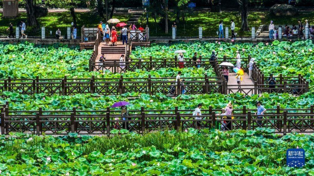 6月10日,游人在南寧市南湖之濱荷花池參觀游覽(無人機(jī)照片)。   新華社發(fā)(劉崢攝)