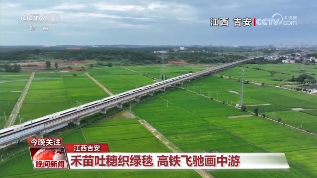 跟隨疾馳的高鐵,飛至江西吉安這片稻田的上空。早早種下的水稻,已經(jīng)進(jìn)入抽穗期。飛馳的高鐵從一塊塊綠毯中呼嘯而過,驚起層層稻浪。這是工業(yè)與農(nóng)業(yè)的交響,這是快與慢的彼此致敬。再過二十多天,這片綠色的田野,將回饋黃澄澄、沉甸甸的稻谷。