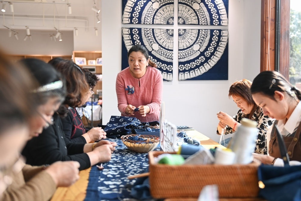 在奉化區(qū)西塢街道雷山村“七彩巧婦”共富工坊,寧波市非物質(zhì)文化遺產(chǎn)藍印花布印染技藝代表性傳承人張劍峰(中)向村民演示手工飾品的制作方法(2023年3月8日攝)。新華社記者 黃宗治 攝