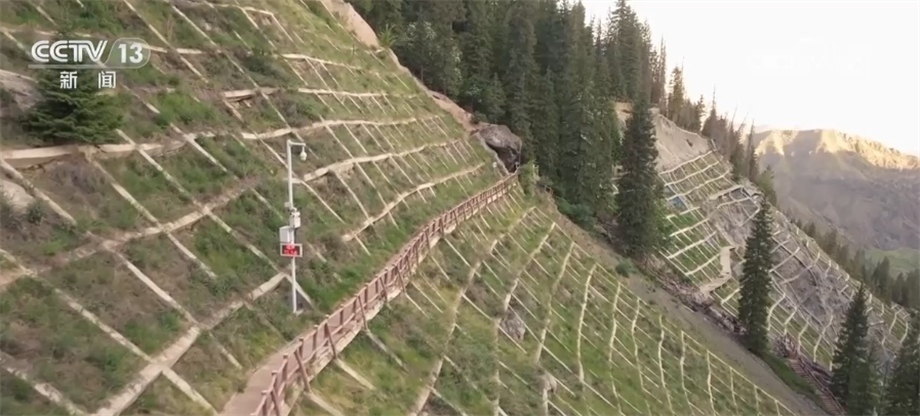 天池的水來自于天山深處的冰川融水,由南向北形成多條瀑布、河流,一路向山下奔流,成為當?shù)刂匾霓r業(yè)灌溉水源,滋養(yǎng)著下游80多萬畝土地。我們現(xiàn)在看到這些鋪在山野中的網格,就是當?shù)卣谶M行的生態(tài)修復與地質災害防治工程,人們在這些網格間播撒草籽,來穩(wěn)定區(qū)域生態(tài)環(huán)境,有效防范地質災害的發(fā)生。