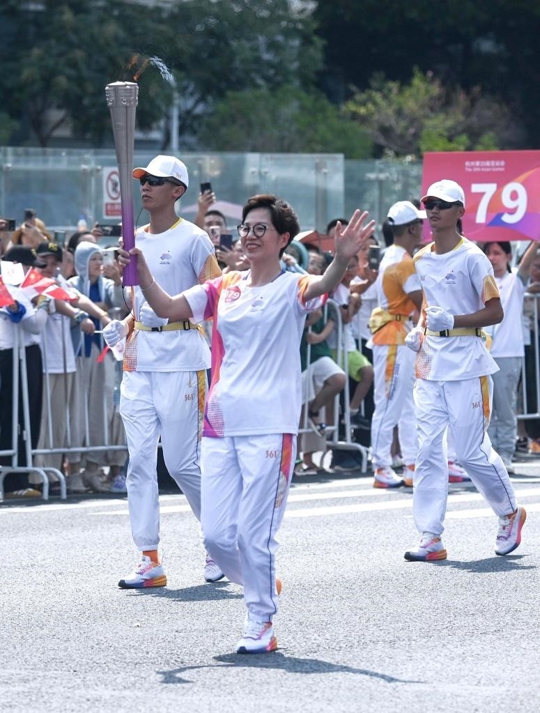 9月8日,火炬手羅雪娟在火炬?zhèn)鬟f中。當日,杭州亞運會火炬?zhèn)鬟f在杭州西湖涌金公園廣場啟動,共有106棒火炬手參與當日傳遞。新華社記者孫非 攝