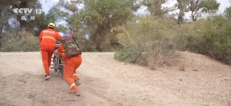 因?yàn)楣茏o(hù)面積大,中午護(hù)林員只能用攜帶的干糧充饑。為了近距離查看胡楊樹(shù)的情況,他們大多數(shù)時(shí)候要在林中小路里穿梭。有的地方路況不好,就需要推著摩托車行走,難免遇到連人帶車陷進(jìn)沙地里的情況,要格外小心。
