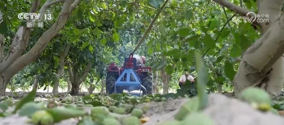總臺記者 卜鵬:這里是位于新疆阿克蘇地區(qū)溫宿縣的一處核桃種植基地,這段時(shí)間正是當(dāng)?shù)睾颂页墒觳烧募竟?jié)。這些核桃樹上,一顆顆青綠渾圓的核桃掛滿枝頭,而在核桃樹底下,當(dāng)?shù)氐墓r(nóng)們正在抓緊撿收被抖落的核桃。為什么說是被抖落的核桃而不是被敲落的核桃?那是因?yàn)?,在?dāng)?shù)匾恍┓N植面積比較大的核桃基地里,當(dāng)?shù)氐墓r(nóng)會選擇利用農(nóng)業(yè)機(jī)械輔助抖動樹干的方式來采收核桃。采收的時(shí)候,果農(nóng)們會把繩索捆綁在核桃樹上,負(fù)責(zé)機(jī)械操作的師傅會根據(jù)樹枝的粗細(xì)來掌握和控制抖動的力度,這樣就能夠避免因?yàn)橛昧^猛而對樹枝產(chǎn)生傷害。經(jīng)過機(jī)器的搖擺,核桃就會接二連三落在地上,相比于人工采摘,機(jī)械采摘的方式效率會更高。