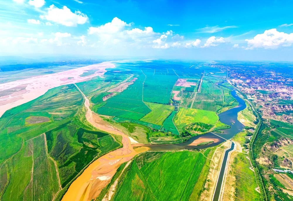 流經(jīng)寧夏青銅峽市境內(nèi)的黃河,滋潤(rùn)著岸邊水稻和各種植被(無(wú)人機(jī)照片,5月25日攝)。新華社記者馮開華 攝