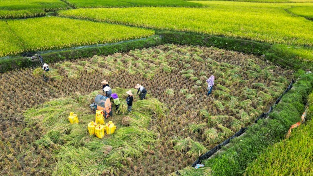 ↑2023年8月29日,貴州省黔東南苗族侗族自治州從江縣貫洞鎮(zhèn)貫洞村,農(nóng)民在田間收割稻谷。CICPHOTO/盧忠南 攝
