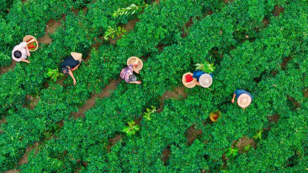 ↑2023年8月28日,河南省商丘市寧陵縣黃崗鎮(zhèn)商會(huì)南魏果蔬種植專(zhuān)業(yè)合作社,農(nóng)民在采摘辣椒。CICPHOTO/徐碩 攝