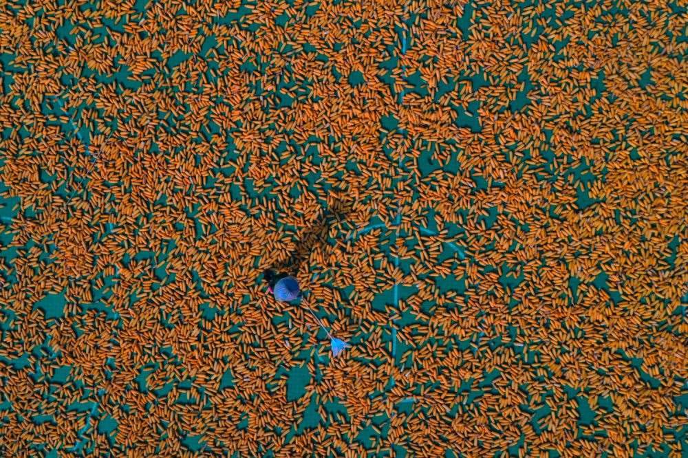 ↑2023年9月10日,重慶市南川區(qū)黎香湖鎮(zhèn)西湖村,農(nóng)民在晾曬收獲的紅辣椒、玉米、綠豆等農(nóng)作物。CICPHOTO/羅川 攝