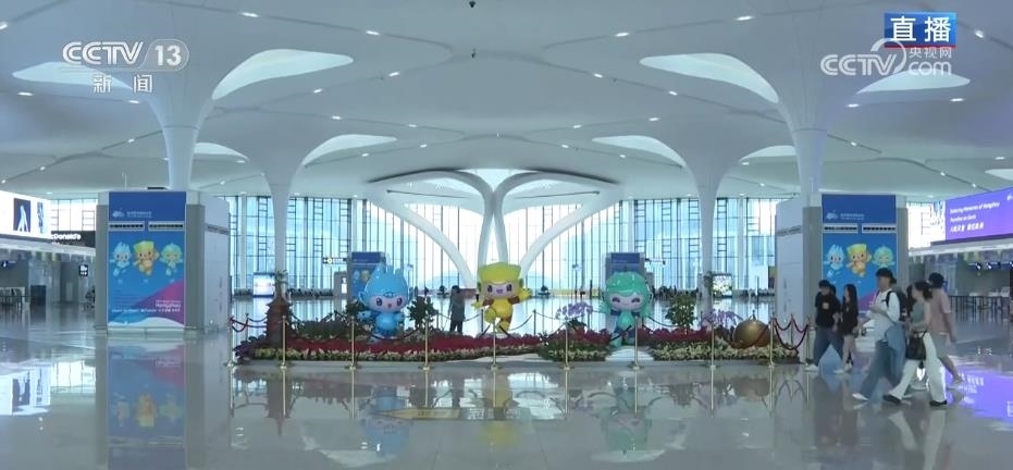 總臺記者 寧婉婷:杭州蕭山國際機(jī)場T4航站樓是本屆亞運(yùn)會人員官方出入境口岸。整個T4航站樓里布滿了亞運(yùn)元素,從亞運(yùn)會的標(biāo)志到吉祥物,到處都充滿了濃濃的亞運(yùn)氛圍,也吸引了很多過往旅客打卡拍照。