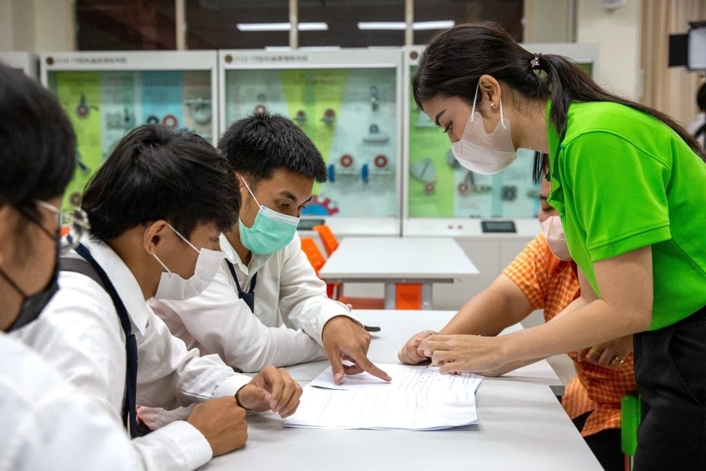 3月14日,在泰國大城府大城技術(shù)學(xué)院魯班工坊,教師(右一)給學(xué)生上課。新華社記者 王騰 攝