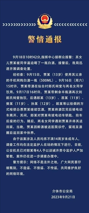 ·13歲女孩被4名未成年人逼喝白酒?山西介休警方通報:4人被訓(xùn)誡。