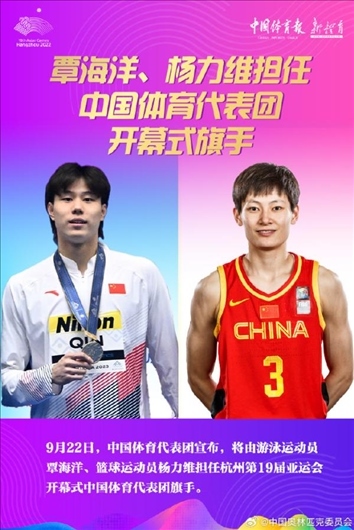 9月22日上午,中國體育代表團(tuán)宣布,將由游泳運(yùn)動員覃海洋、籃球運(yùn)動員楊力維擔(dān)任杭州亞運(yùn)會開幕式中國體育代表團(tuán)旗手。