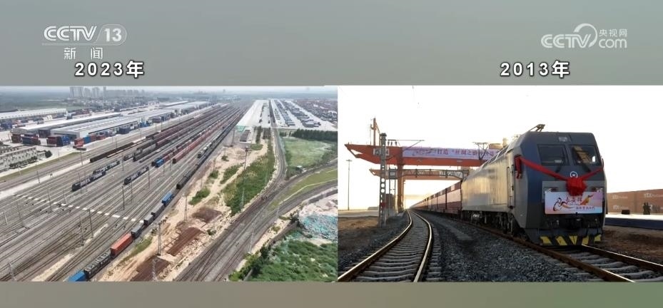 幾百輛剛出廠的新能源汽車整齊地排列在站臺(tái)上陸續(xù)裝箱,馬上它們將乘坐中歐班列“長安號(hào)”前往中亞。2023年是“一帶一路”倡議提出10周年,也是中歐班列“長安號(hào)”開行10周年。每天都有數(shù)以億計(jì)的貨物在這里集散。