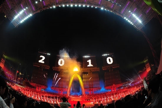 2010年11月12日,廣州,第十六屆亞運(yùn)會(huì)開幕式在海心沙島隆重舉行,圖為主火炬點(diǎn)火儀式。視覺中國供圖