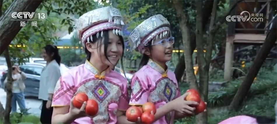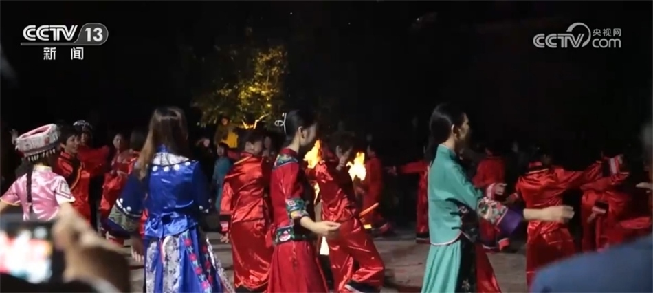 隨著歡快的音樂響起,當(dāng)?shù)卮迕翊┥仙术r艷的節(jié)日盛裝,踏著鼓點(diǎn),圍著篝火跳起土家擺手舞,豐收的喜悅洋溢在村民們的臉上,游客們加入其中,大家手牽著手,共同舞出金秋和美鄉(xiāng)村新畫卷。