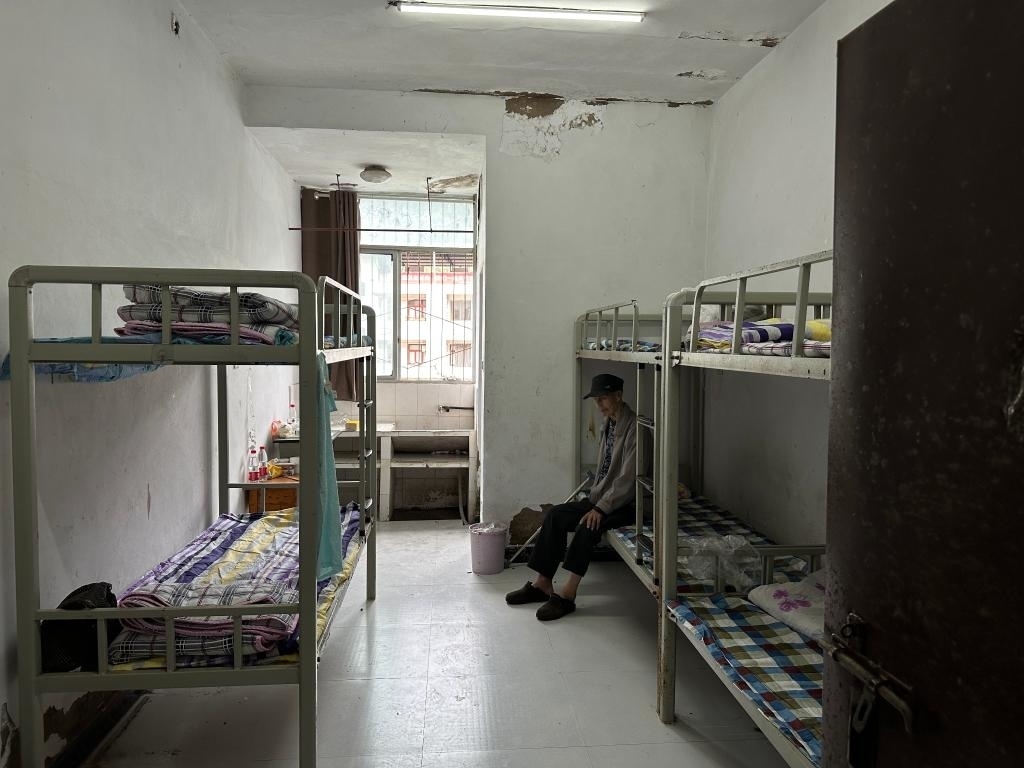 太白西村4組村民譚建和老爺爺行動(dòng)不便,坐在鋪著干凈格子床單的宿舍床上望向窗外?!扒疤煜挛纾鐓^(qū)的車來(lái)接的我和老伴,安置點(diǎn)吃喝都好,宿舍住起來(lái)也挺舒服。兒子們擔(dān)心我,他們過不來(lái),一天就打好幾通電話,我說都好著呢、好著呢?!弊T爺爺說。