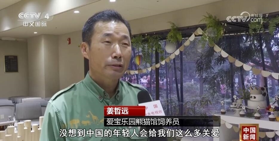 愛寶樂園熊貓館飼養(yǎng)員 姜哲遠(yuǎn):沒想到中國的年輕人會給我們這么多關(guān)愛,非常感謝也非常珍惜大家給我們的關(guān)注。我能做的事情其實就是像現(xiàn)在這樣,讓福寶繼續(xù)茁壯成長。