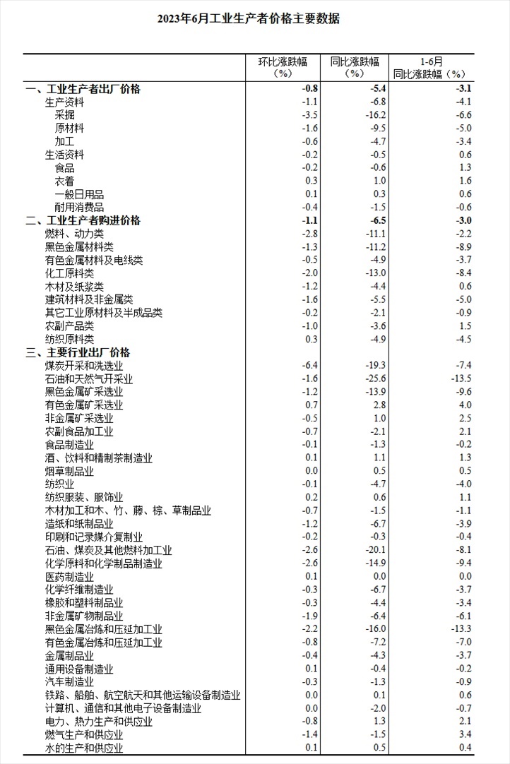 6月工業(yè)生產(chǎn)者出廠價格同比下降5.4%,環(huán)比下降0.8%