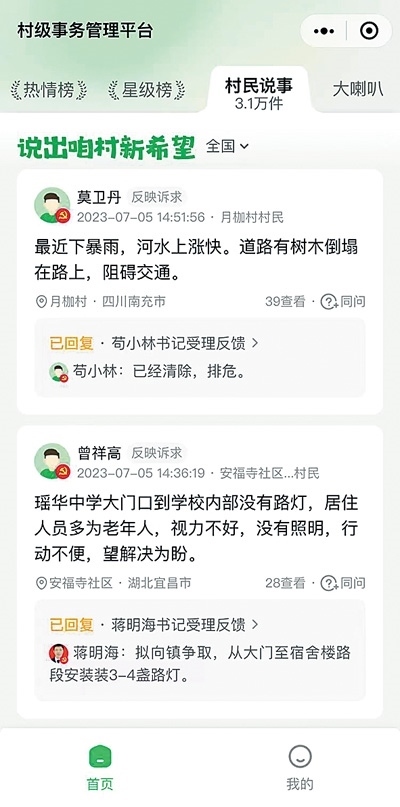 “老百姓把遇到的問題發(fā)布,我們看到后及時回復(fù)、解決,大大提高了工作效率。”舒軍說,他已經(jīng)養(yǎng)成習(xí)慣,每天都會看看村民在小程序說了啥事。