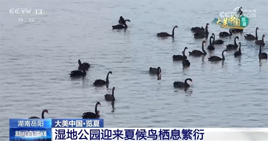 時(shí)值盛夏,湖南岳陽湘陰的洋沙湖-東湖國家濕地公園引來大批夏候鳥來此棲息繁衍。碧波蕩漾、清荷搖曳,黑天鵝在此嬉戲覓食,麋鹿閑庭信步、悠然自得。