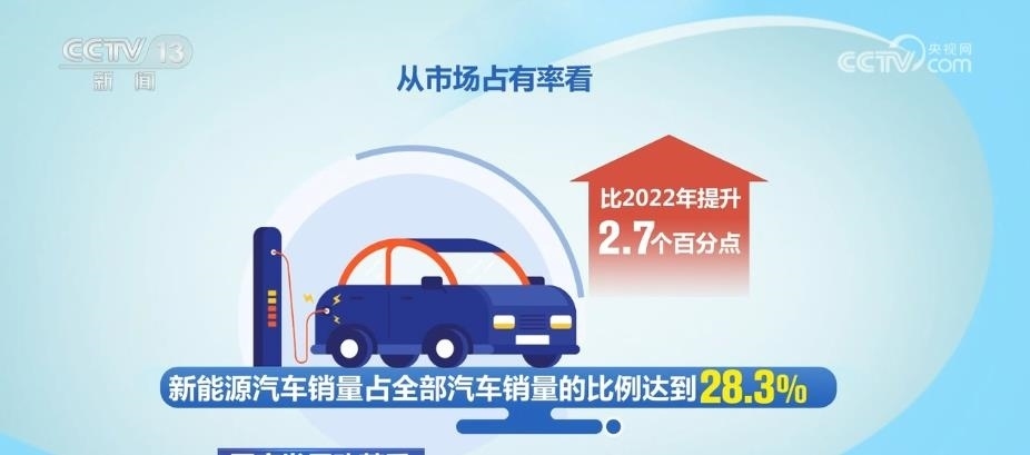 從市場占有率看,新能源汽車銷量占全部汽車銷量的比例達(dá)到28.3%,比2022年提升2.7個(gè)百分點(diǎn)。