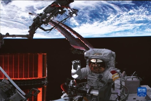 這是在北京航天飛行控制中心拍攝的神舟十六號(hào)航天員朱楊柱成功出艙后揮手致意的畫面。