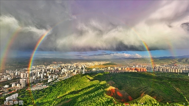 青海省西寧市一場(chǎng)云雨過后,天空出現(xiàn)雙彩虹。