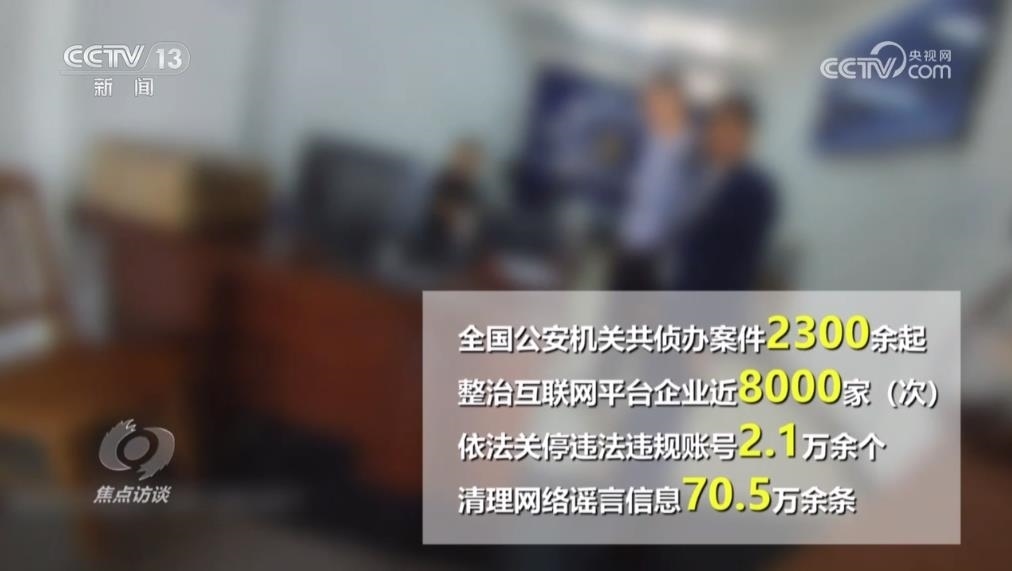 今年4月以來,公安部網(wǎng)安局部署開展為期100天的網(wǎng)絡(luò)謠言打擊整治專項行動,全國公安機(jī)關(guān)共偵辦案件2300余起,整治互聯(lián)網(wǎng)平臺企業(yè)近8000家(次),依法關(guān)停違法違規(guī)賬號2.1萬余個,清理網(wǎng)絡(luò)謠言信息70.5萬余條,對網(wǎng)絡(luò)謠言違法犯罪形成強(qiáng)大震懾。